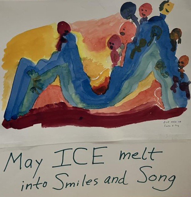 Love as Action, the first of a series of worshipful protests, was held on Saturday January 17 in the front yard of our meetinghouse. The 25 Friends and neighbors In Memphis were joining Friends in a dozen or more cities to build a collective presence against the rising authoritarianism. The day was cold, but hope was high, and hot tea, cocoa and fellowship after the gathering warmed our spirits. At least two more Love as Action events are being scheduled for February and March — times and places to be announced. Ron made this sign: May ICE melt into smiles and song. More info: www.afsc.org/love-action