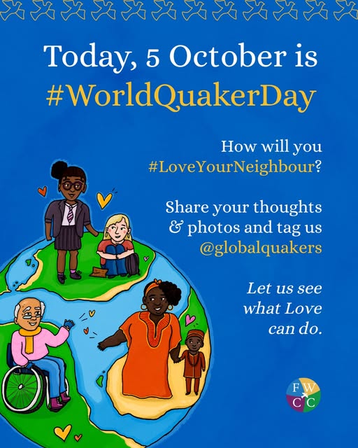 October 5 is World Quaker Day. Consider joining us for worship at 11:00 and potluck at the rise of meeting (around 12:15). All are welcome!